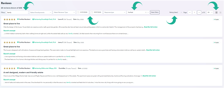HomeViews top tip: Click the four squares in the top right so you can see where your search word appears in each review to quickly pull quotes for your campaign.