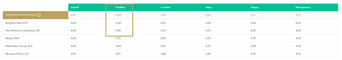 For example, looking at the Selected development scores table you could say: “The Whitmore Collection scored 4.92 out of 5 for Facilities, which is above the HomeViews BTR Benchmark of 4”